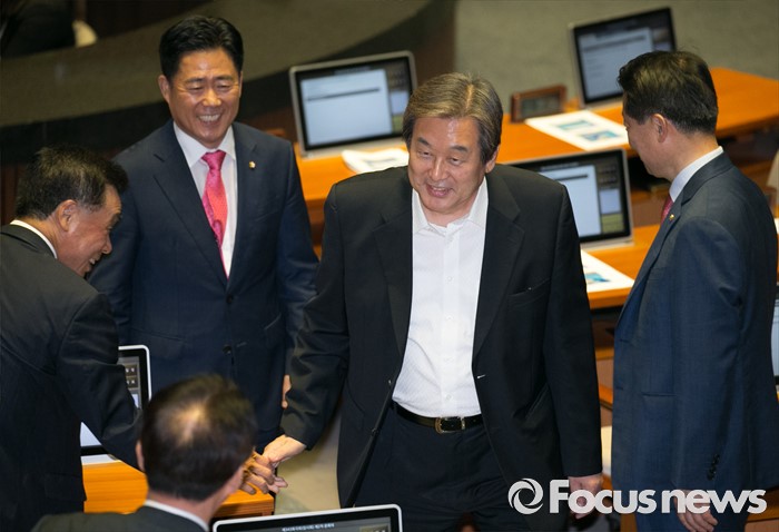 (서울=포커스뉴스) 13일 오후 서울 여의도 국회에서 상임위원장 선출을 위해 열린 343회 국회(임시회) 2차 본회의에 참석한 김무성 새누리당 전 대표가 동료 의원들과 인사하고 있다.