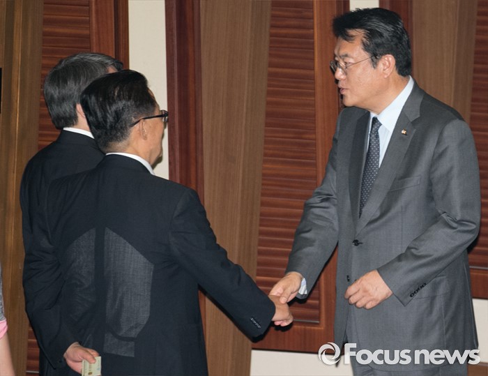 (서울=포커스뉴스) 13일 오후 서울 여의도 국회에서 상임위원장 선출을 위해 열린 343회 국회(임시회) 2차 본회의에 참석한 정진석(오른쪽) 새누리당 원내대표가 투표 후 안철수 국민의당 상임공동대표, 박지원 원내대표와 인사하고 있다.