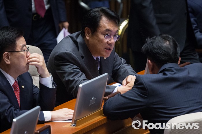 (서울=포커스뉴스) 13일 오후 서울 여의도 국회에서 상임위원장 선출을 위해 열린 343회 국회(임시회) 2차 본회의에 참석한 정진석 새누리당 원내대표가 의원들과 대화하고 있다.