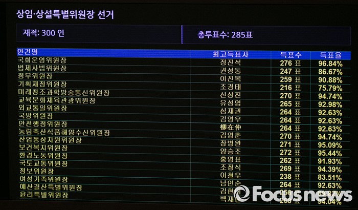 (서울=포커스뉴스) 13일 오후 서울 여의도 국회에서 상임위원장 선출을 위해 열린 343회 국회(임시회) 2차 본회의에서 위원장 선출 투표 결과가 전광판을 통해 보이고 있다.