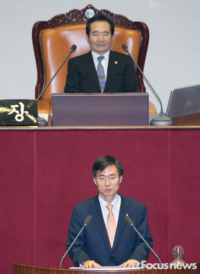 (서울=포커스뉴스) 13일 오후 서울 여의도 국회에서 열린 343회 국회(임시회) 2차 본회의에 참석한 조경태 신임 기획재정위원장이 당선 인사를 하고 있다.