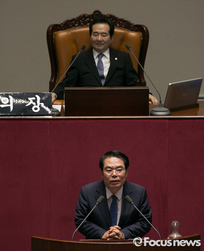 (서울=포커스뉴스) 13일 오후 서울 여의도 국회에서 열린 343회 국회(임시회) 2차 본회의에 참석한 백재현 신임 윤리특별위원장이 당선 인사를 하고 있다.