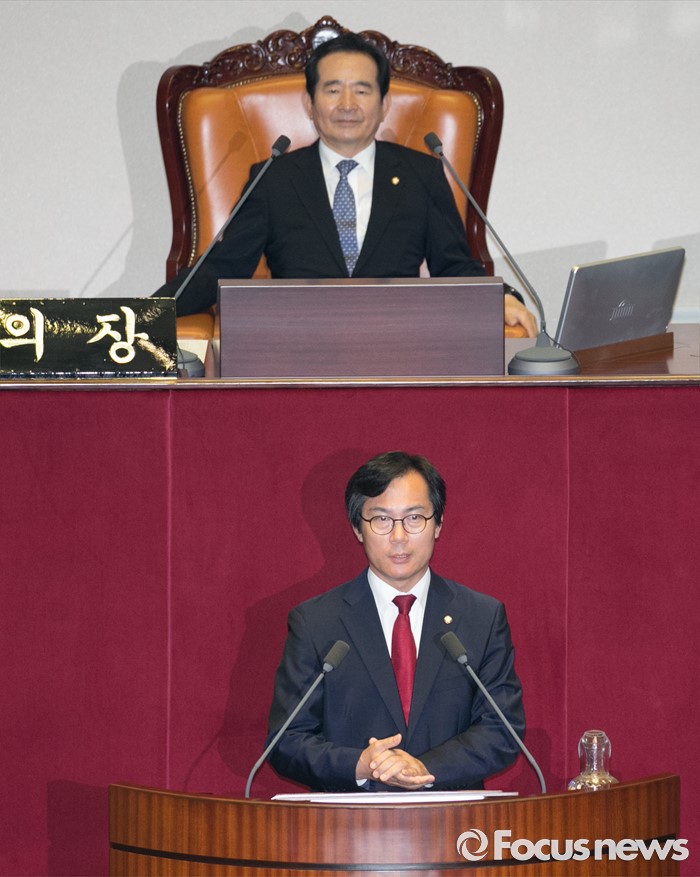 (서울=포커스뉴스) 13일 오후 서울 여의도 국회에서 열린 343회 국회(임시회) 2차 본회의에 참석한 김영우 신임 국방위원장이 당선 인사를 하고 있다.