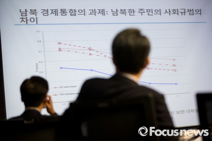 (서울=포코스뉴스) 국민의당 의원들이 14일 오전 서울 여의도 국회 의원회관에서 열린 국민의당 워크숍에서 '남북 경제통합의 과제: 남북한 주민의 사회 규범의 차이' 그래프를 보고 있다.