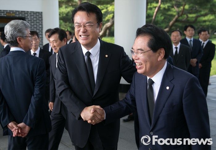 (서울=포커스뉴스) 정진석(왼쪽) 새누리당 원내대표와 백재현 윤리특별위원장이 14일 오전 동작구 국립서울현충원을 방문해 참배를 마친 뒤 인사하고 있다.