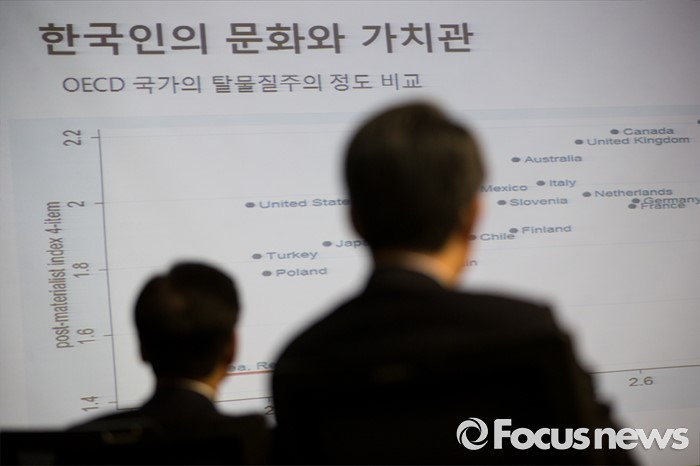 (서울=포코스뉴스) 국민의당 의원들이 14일 오전 서울 여의도 국회 의원회관에서 열린 국민의당 워크숍에서 'OECD 국가의 탈물질주의 정도 비교' 그래프를 보고 있다.