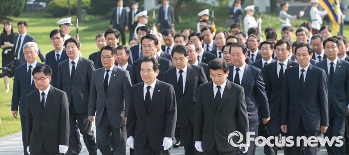 (서울=포커스뉴스) 정세균 국회의장과 정진석 새누리당 원내대표, 우상호 더불어민주당 원내대표, 박지원 국민의당 원내대표, 20대 국회 전반기 상임위원장들이 14일 오전 동작구 국립서울현충원을 방문해 참배를 위해 이동하고 있다.