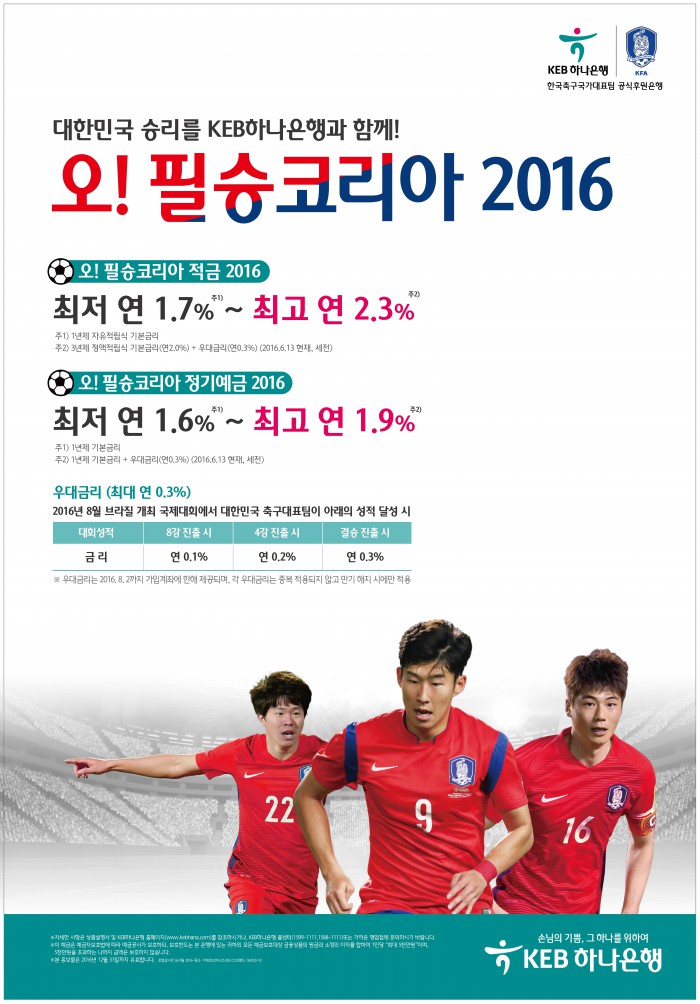 (서울=포커스뉴스) KEB하나은행은 오는 8월 대한민국 올림픽 축구 국가대표팀 경기 성적에 따라 우대금리를 제공하는 '오! 필승코리아 적금·정기예금 2016'을 출시했따고 14일 밝혔다.