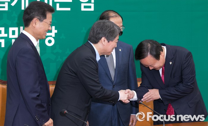 (서울=포커스뉴스) 안철수(왼쪽 두번째) 국민의당 상임공동대표, 천정배(왼쪽 첫번째) 공동대표가 14일 오전 서울 여의도 국회를 방문한 이원종(오른쪽 두번째) 대통령비서실장, 김재원 청와대 정무수석과 인사하고 있다.