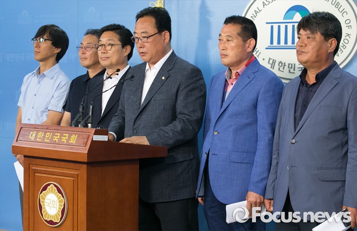 (서울=포커스뉴스) 어기구(오른쪽 세번째) 더불어민주당 의원과 충남 석탄화력발전소 설치지역 관련 기초단체장들이 14일 오전 서울 여의도 국회 정론관에서 미세먼지 대책관련 공동 기자회견을 하고 있다.