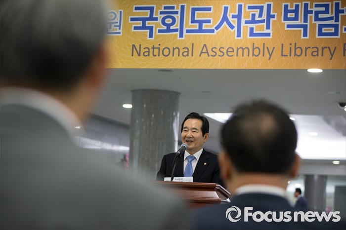 (서울=포커스뉴스) 정세균 국회의장이 14일 오전 서울 여의도 국회 의원회관에서 열린 국회도서관 박람회 개막식에 참석해 축사하고 있다.