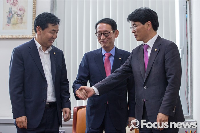 (서울=포커스뉴스) 14일 오전 서울 여의도 국회에서 3당 원내수석이 회동에 앞서 손을 맞잡고 있다. 왼쪽부터 김관영 국민의당 원내수석부대표, 김도읍 새누리당 원내수석부대표, 박완주 더불어민주당 원내수석부대표.