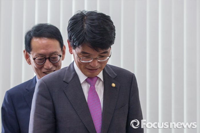 (서울=포커스뉴스) 김도읍(왼쪽) 새누리당 원내수석부대표와 박완주 더불어민주당 원내수석부대표가 14일 오전 서울 여의도 국회에서 열린 3당 원내수석회동에 앞서 악수한 뒤 자리로 이동하고 있다.