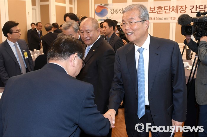 (서울=포커스뉴스) 김종인(오른쪽) 더불어민주당 비대위 대표가 14일 오전 서울 여의도 국회 귀빈식당에서 열린 보훈단체장과의 간담회에 참석해 단체 관계자들과 인사하고 있다.