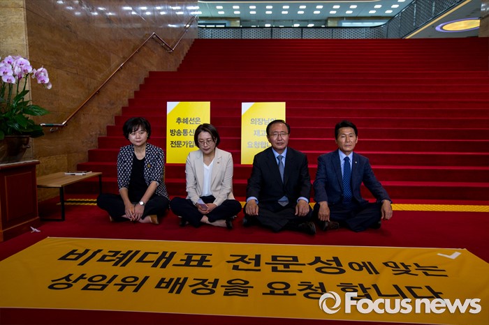 (서울=포커스뉴스) 정의당 의원들이 14일 오전 서울 여의도 국회 로텐더홀 계단 앞에서 상임위 배정 관련 기자회견을 마친 뒤 농성을 하고 있다. 왼쪽부터 이정미 원내수석부대표, 추혜선 의원, 노회찬 원내대표, 윤소하 의원.