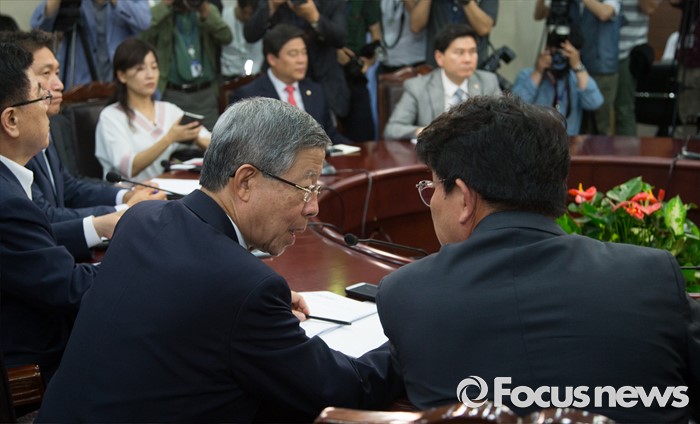 (서울=포커스뉴스) 김희옥(왼쪽) 새누리당 혁신비상대책위원장과 권성동(오른쪽) 사무총장이 14일 오후 서울 여의도 국회에서 열린 혁신비상대책위원 회의에서 대화하고 있다.