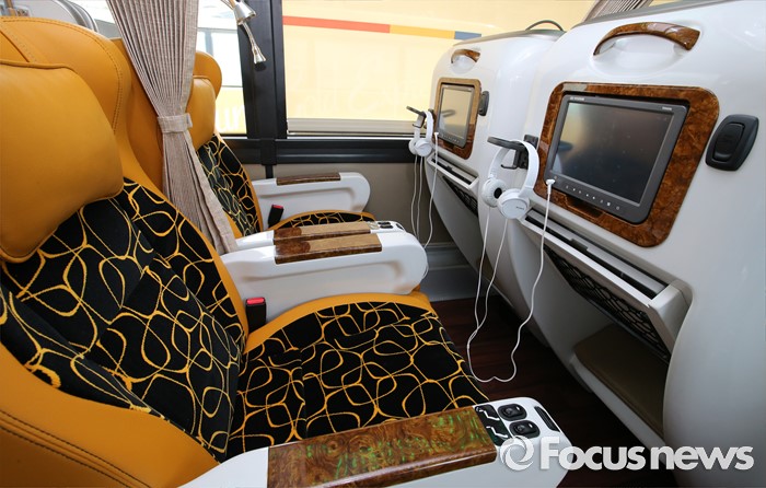 (세종=포커스뉴스) 프리미엄 고속버스 도입에 앞서 시승행사가 14일 오전 세종시 정부세종청사 제2주차장에서 열렸다. 사진은 현대자동차 21인승 프레스티지 유니버스 내부모습.
