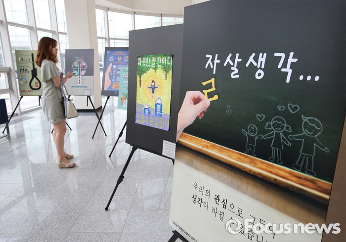 (세종=포커스뉴스) 14일 오후 세종시 정부세종청사 15동 대강당에서 열린 생명존중 교육자료 및 수기공모전 시상식에서 참가자가 수상작품을 바라보고 있다.