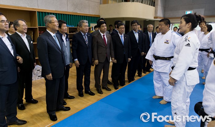 (서울=포커스뉴스) 리우데자네이루 하계올림픽을 52일여 앞둔 14일 오후 서울 노원구 태릉선수촌을 방문한 김종인 더불어민주당 비상대책위원회 대표가 국가대표 선수들을 격려하고 있다.