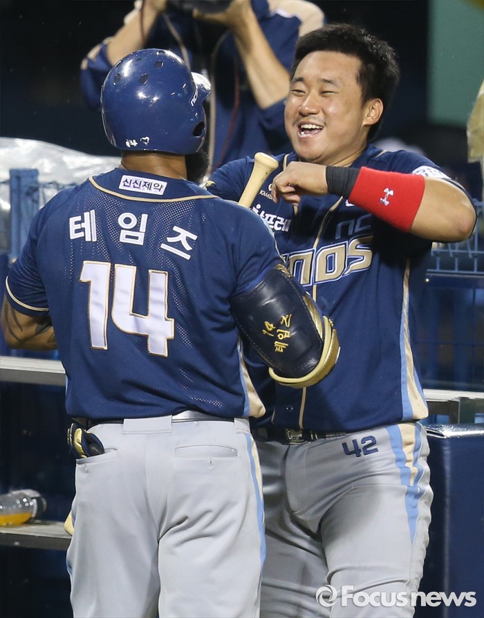 | △ 김태군과 세레머니하는 NC 테임즈 |