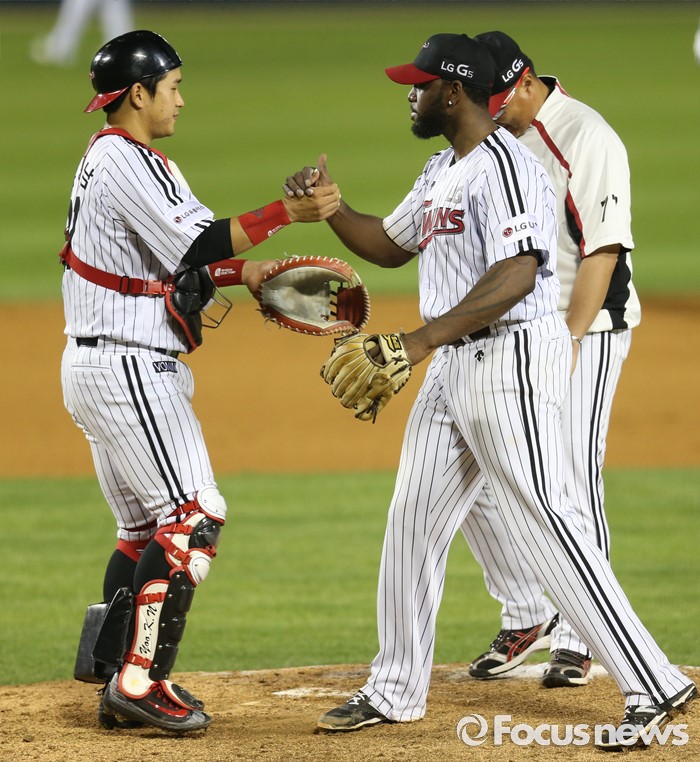 (서울=포커스뉴스) 14일 서울 잠실구장에서 열린 2016 프로야구 NC-LG 경기 8회초 1사 2루에서 LG 소사가 투수교체로 마운드를 내려가며 포수 유강남과 악수하고 있다.