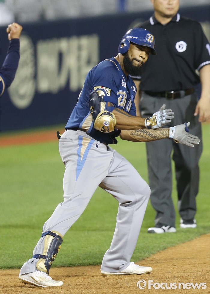 (서울=포커스뉴스) 14일 서울 잠실구장에서 열린 2016 프로야구 NC-LG 경기 9회초 1사 만루에서 NC 테임즈가 주자를 모두 불러 들이는 우익수앞 3루타를 치고 3루에서 환호하고 있다.