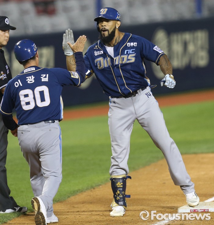 (서울=포커스뉴스) 14일 서울 잠실구장에서 열린 2016 프로야구 NC-LG 경기 9회초 1사 만루에서 NC 테임즈가 주자를 모두 불러 들이는 우익수앞 3루타를 치고 3루에서 이광길 코치와 하이파이브하고 있다.