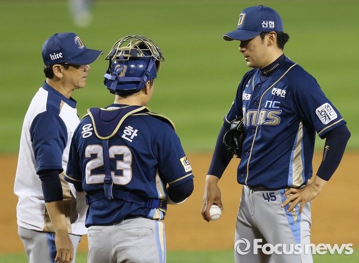 (서울=포커스뉴스) 14일 서울 잠실구장에서 열린 2016 프로야구 NC-LG 경기 9회말 NC 최일언 코치가 마운드에 올라가 투수 임창민과 대화하고 있다.