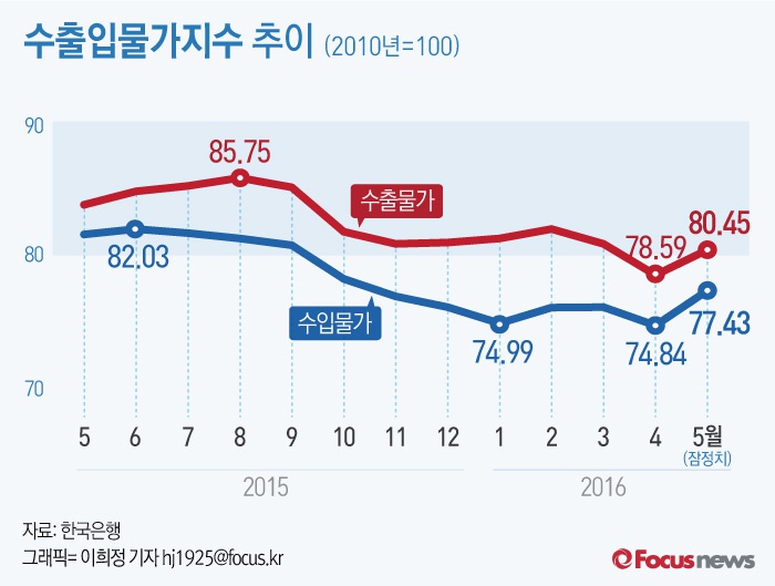 (서울=포커스뉴스) 한국은행이 15일 공개한 ‘2016년 5월 수출입물가지수’를 보면 지난달 수출물가지수는 80.45로 전월 대비 2.4% 상승했다. 같은 기간 수입물가지수도 전월보다 3.5% 오른 77.43으로 집계됐다.