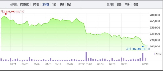 메리츠종금증권은 롯데홈쇼핑에 대해 “6개월간 프라임타임 영업정지 처분으로 하반기 홈쇼핑사업의 매출액 감소와 수익성 하락이 불가피할 것”으로 내다봤다.주가흐름<사진출처=네이버 캡쳐>