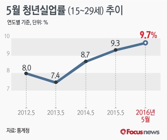 (서울=포커스뉴스) 15일 통계청이 공개한 ‘5월 고용동향’에 따르면 지난달 청년실업률(15~29세)은 9.7%로 전달보다 1.2%포인트 감소했다. 그러나 5월을 기준으로 할 경우 통계 작성 시작 연도인 1999년 이후 역대 최고치다. 지난해 5월 청년실업률은 9.3%를 기록한 바 있다.