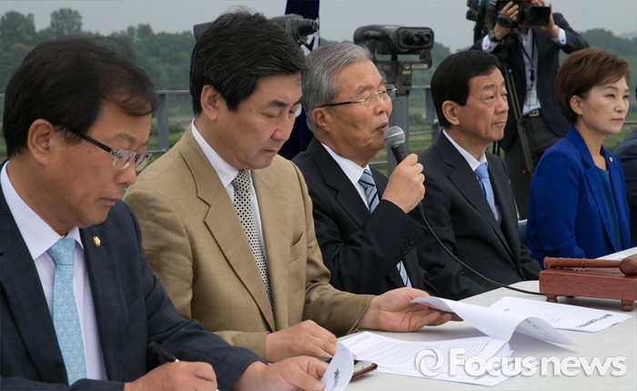 (파주=포커스뉴스) 15일 오전 경기도 파주 임진각 통일전망대에서 열린 더불어민주당 비상대책위원회의에 참석한 김종인(오른쪽 세번째) 비대위 대표가 모두발언을 하고 있다.