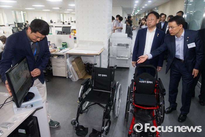 낙상 방지 휠체어 설명 듣는 유일호 부총리