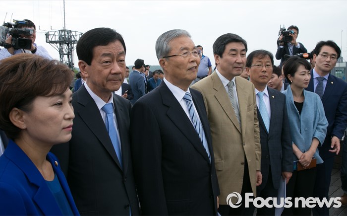 (파주=포커스뉴스) 15일 오전 경기도 파주 임진각 통일전망대에서 더불어민주당 비상대책위원회의를 마친 김종인 비대위 대표와 의원들이 임진각 철교 주변을 바라보고 있다.