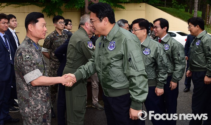 (오산=포커스뉴스) 정진석(오른쪽) 새누리당 원내대표와 의원들이 15일 오전 경기도 오산 공군작전사령부를 방문해 군 관계자들과 인사하고 있다.