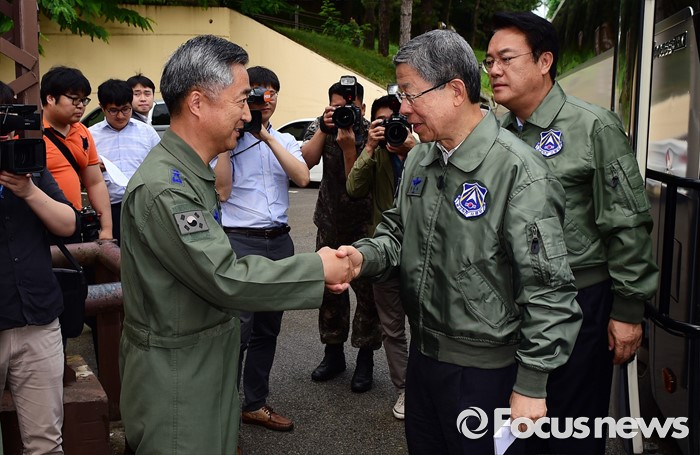 (오산=포커스뉴스) 김희옥(가운데) 새누리당 혁신비상대책위원장, 정진석(오른쪽) 원내대표가 15일 오전 경기도 오산 공군작전사령부를 방문해 이왕근 공군 작전사령관과 인사하고 있다.