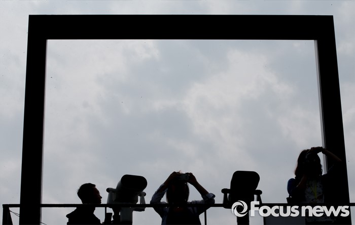 (파주=포커스뉴스) 6·15 남북공동선언 16주기인 15일 오전 경기도 파주 임진각 통일전망대를 방문한 관광객들이 북녘을 살펴보고 있다.