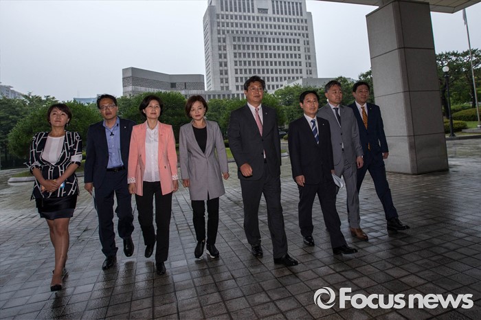 (서울=포커스뉴스) 15일 오후 서울 서초구 대검찰청 앞에서 더불어민주당 '어버이연합 등 불법자금지원 의혹 규명 진상조사 특별팀 (TF)' 이 항의 방문하고 있다. 왼쪽부터 더불어민주당 이재정, 박주민, 백혜련, 진선미, 이춘석, 박범계, 표창원, 김병기 의원.