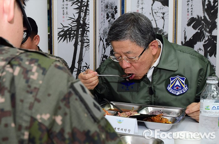 (오산=포커스뉴스) 김희옥 새누리당 혁신비상대책위원장이 15일 오후 경기도 오산 공군작전사령부를 방문해 장병들과 함께 오찬을 하고 있다.