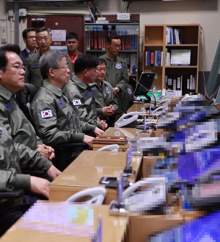 (오산=포커스뉴스) 김희옥 새누리당 혁신비대위원장, 정진석 원내대표 등 의원들이 15일 경기도 오산 공군작전사령부를 방문해 항공우주작전본부 내 지휘소에서 작전현황에 대한 브리핑을 받고 있다. <사진제공=공군>
