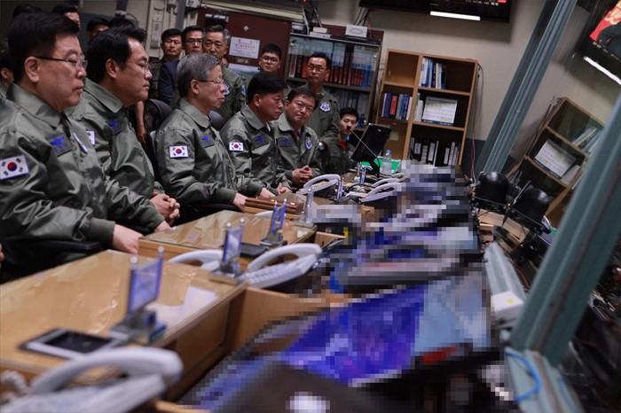 (오산=포커스뉴스) 김희옥 새누리당 혁신비대위원장, 정진석 원내대표 등 의원들이 15일 경기도 오산 공군작전사령부를 방문해 항공우주작전본부 내 지휘소에서 작전현황에 대한 브리핑을 받고 있다. <사진제공=공군>
