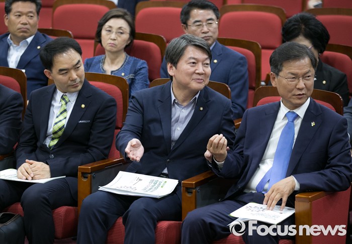 (서울=포커스뉴스) 15일 오후 서울 여의도 국회 의원회관에서 열린 '소비자 집단소송과 징벌적 손해배상제도 쟁점과 방향' 토론회에 참석한 안철수(앞줄 가운데) 국민의당 상임공동대표, 천정배(앞줄 오른쪽) 공동대표가 서로 축사 순서를 양보하고 있다.