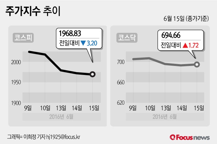 (서울=포커스뉴스) 15일 코스피지수는 전날 보다 0.16%(3.20포인트) 내린 1968.83에 장을 마쳤다. 코스닥지수는 전일 대비 0.25%(1.72포인트) 오른 694.66에 마감했다.