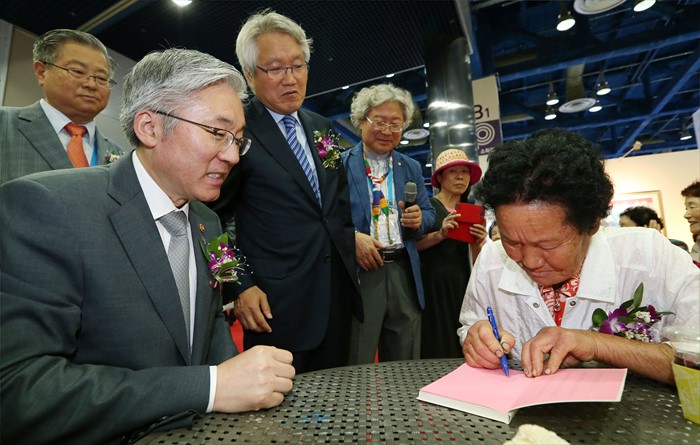 (서울=포커스뉴스) 김종덕 문화체육관광부 장관이 15일 서울 강남구 코엑스에서 열린 ‘제22회 서울국제도서전 및 제3회 디지털북페어코리아 개막식‘을 마치고 카페에서 ’시가 뭐고’의 저자인 소화자 경북 칠곡군 할머니 시인을 만나 책에 사인을 받고 있다. <사진제공=문화체육관광부>