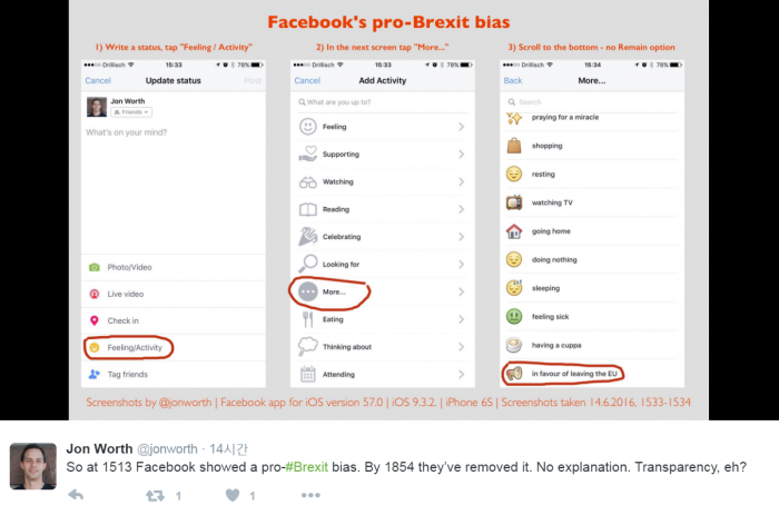 페이스북 일부 이용자들은 페이스북이 상태 업데이트 '기분/활동'란에 '유럽연합(EU) 탈퇴 지지'라는 항목을 개설한 것에 반발하고 있다. 유저들에게 브렉시트를 지지하도록 강요한 것이라고 주장하고 있다.