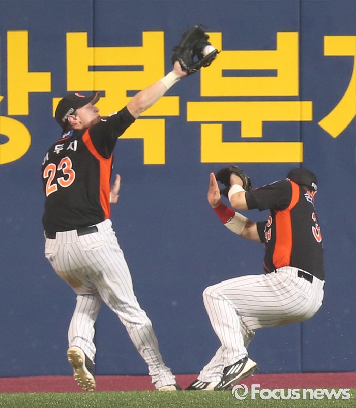 (서울=포커스뉴스) 15일 서울 고척 스카이돔 구장에서 열린 2016 프로야구 롯데-넥센 경기 8회말 무사 1,2루에서 롯데 중견수 아두치가 넥센 장영석의 외야 플라이를 잡고 있다.