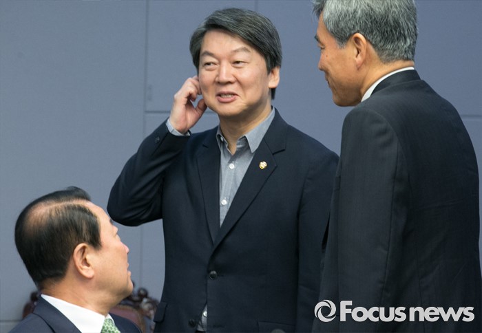 (서울=포커스뉴스) 16일 오전 서울 여의도 국회 의원회관에서 열린 국민의당 16차 정책역량강화 워크숍에 참석한 박주선(왼쪽부터) 국회 부의장, 안철수 상임공동대표, 이상돈 진상조사단장이 대화하고 있다. 리베이트 수수 의혹을 받고 있는 김수민 의원은 이날 워크숍에 불참했다.