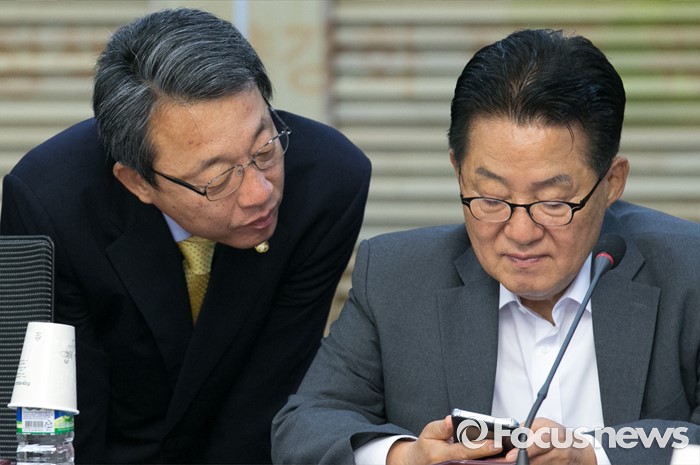 (서울=포커스뉴스) 16일 오전 서울 여의도 국회 의원회관에서 열린 국민의당 16차 정책역량강화 워크숍에 참석한 박지원(오른쪽) 원내대표와 김성식 정책위의장이 대화하고 있다.