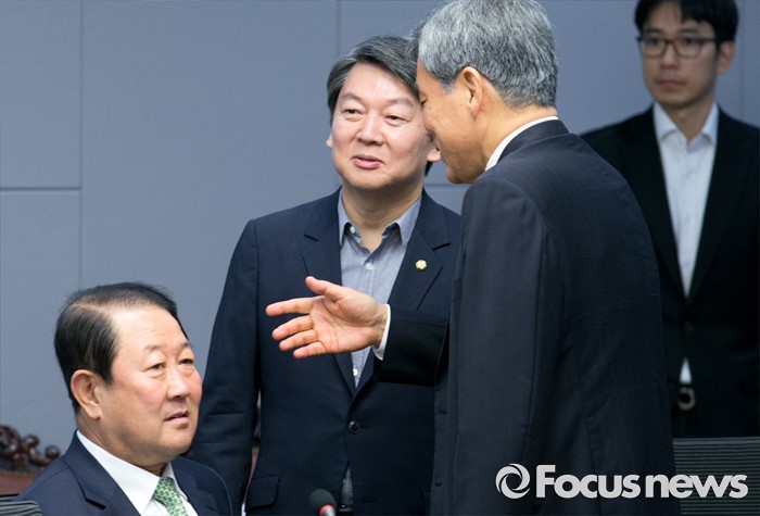 (서울=포커스뉴스) 16일 오전 서울 여의도 국회 의원회관에서 열린 국민의당 16차 정책역량강화 워크숍에 참석한 박주선(왼쪽부터) 국회 부의장, 안철수 상임공동대표, 이상돈 진상조사단장이 대화하고 있다. 리베이트 수수 의혹을 받고 있는 김수민 의원은 이날 워크숍에 불참했다.