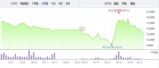 현대상선은 해외 선주들에게 3년 반 동안 내야할 용선료(2조500억원)의 21%인 5300억원 인하 합의를 발표했다. 현대상선은 현재 6개 해운사가 결성한 글로벌 해운동맹인 디 얼라이언스 가입을 추진 중이다.주가흐름<사진출처=네이버 캡쳐>